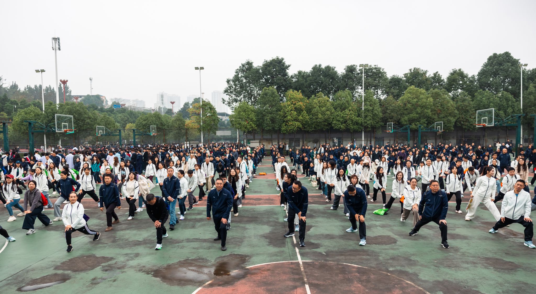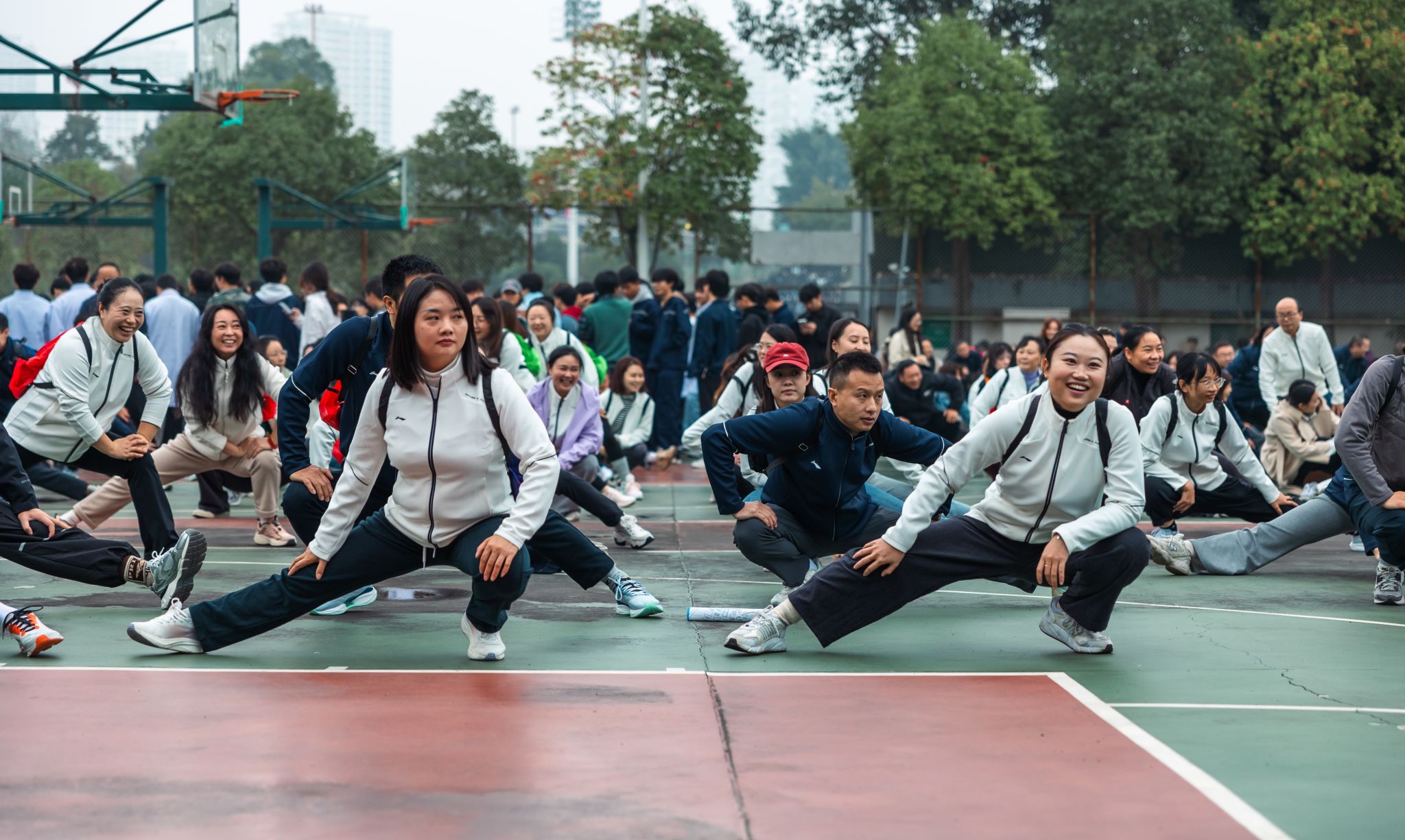 清晨的校园微风拂动,篮球场上人头攒动,处处洋溢着热烈而欢快的气氛。参赛教职工统一身着运动服装,精神饱满地陆续集结。在专业健身教练的带领下,大家整齐列队,认真进行赛前热身——伸展、弯腰、踢腿,一系列规范到位的动作,既有效预防了运动损伤,也点燃了全场的运动激情。教职工们互相提醒动作要领,彼此加油鼓劲,现场氛围温馨而昂扬。
