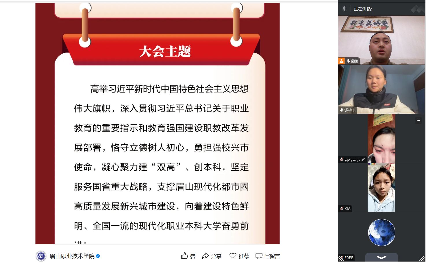 本次活动围绕“四个一”工程展开,构建了“知—行—合”三位一体的实践育人闭环。通过《青春解码党代会:一场“青春视角”云端导读会》《青春献策眉山行:一次“专业赋能”的眉山观察行》《绘就青春蓝图:一份“我与2030”的成长规划书》《青春答卷话收获:一场“青春建功”分享会》四大主题环节,引导学生将专业学习融入发展大局,切实提升实践能力与规划意识,为学校“建‘双高’、创本科”目标汇聚青春力量。在青春解码党代会环节,辅导员们立足学生成长实际召开云端导读会,以生动鲜活的语言解读学校发展蓝图,重点围绕“五育并举”“创新创业”等育人导向,帮助学生明确成长路径,将党代会精神转化为奋进动力。其他活动中,学生踊跃参与,提交了多份观察笔记与成长规划,展现了旅财学子扎根专业、心系社会、勤于思索、勇于实践的良好风貌。