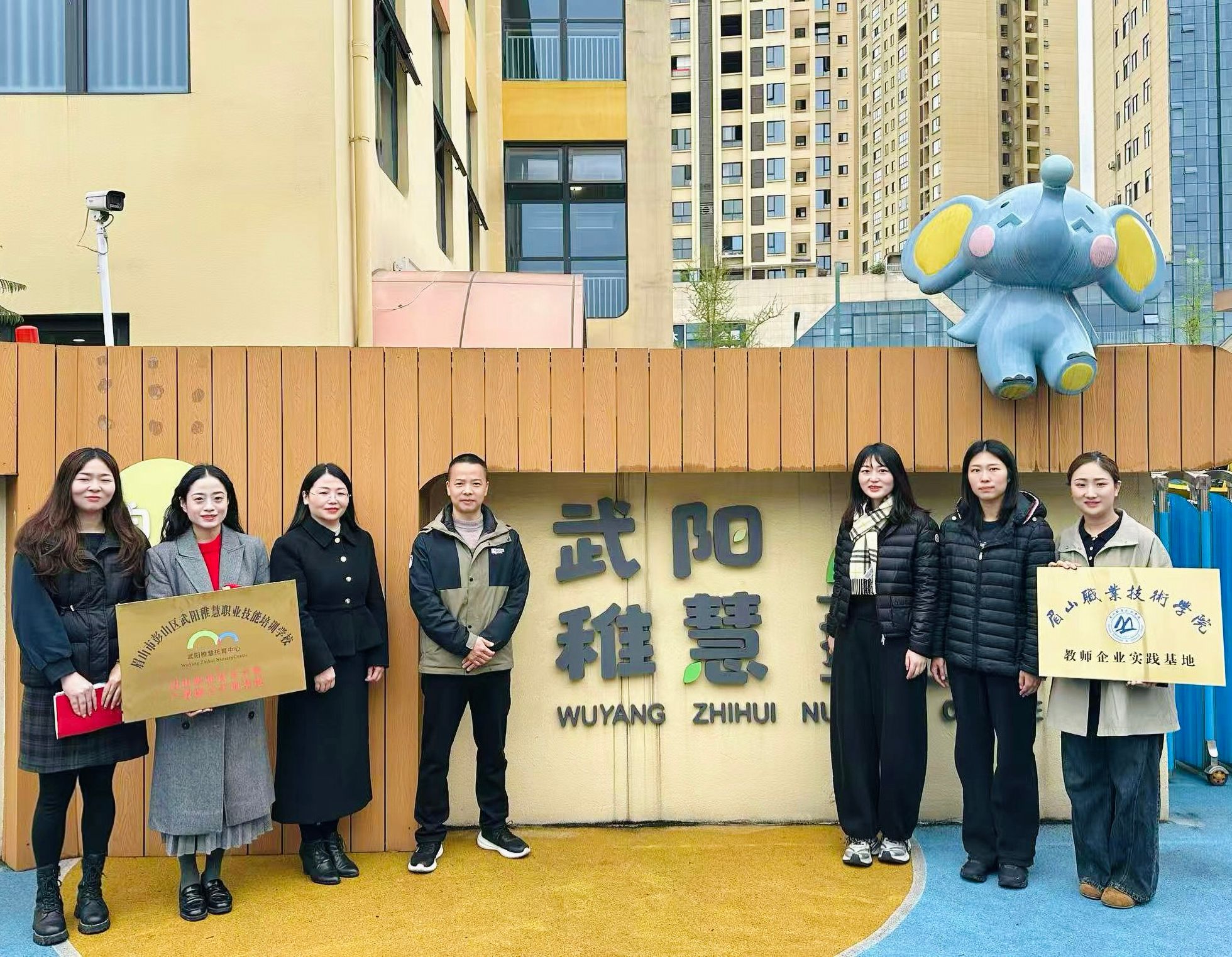 3月18日,教育与文化传媒学院与眉山市彭山区武阳稚慧托育中心在彭山区隆重举行校企合作签约暨基地授牌仪式。教育与文化传媒学院副院长王其红、学前教育教研室主任王甜然,眉山市彭山区卫生健康局爱卫中心主任许仲辉、人口监测与家庭发展股股长夏杨婷,眉山市彭山区武阳稚慧职业技能培训学校有限公司副总经理宋姗、武阳稚慧托育中心园长周琴出席活动。眉山市彭山区武阳稚慧职业技能培训学校有限公司法定代表人廖梦黎主持仪式。