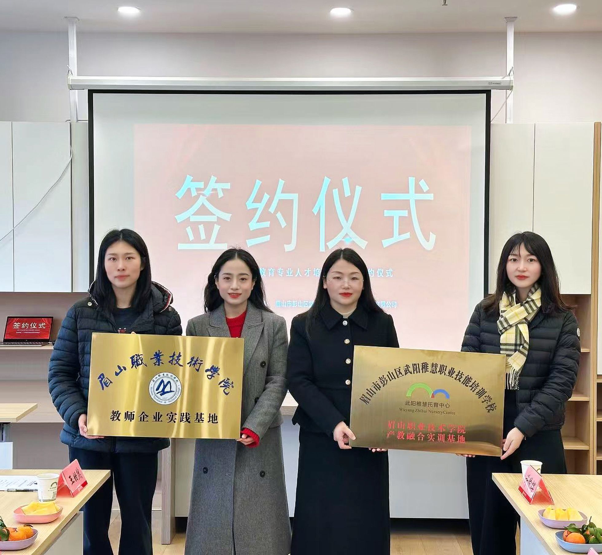 在与会人员的共同见证下,双方代表签署校企合作协议,并举行基地授牌仪式。此次签约标志着教育与文化传媒学院与武阳稚慧托育中心正式建立战略合作关系。
