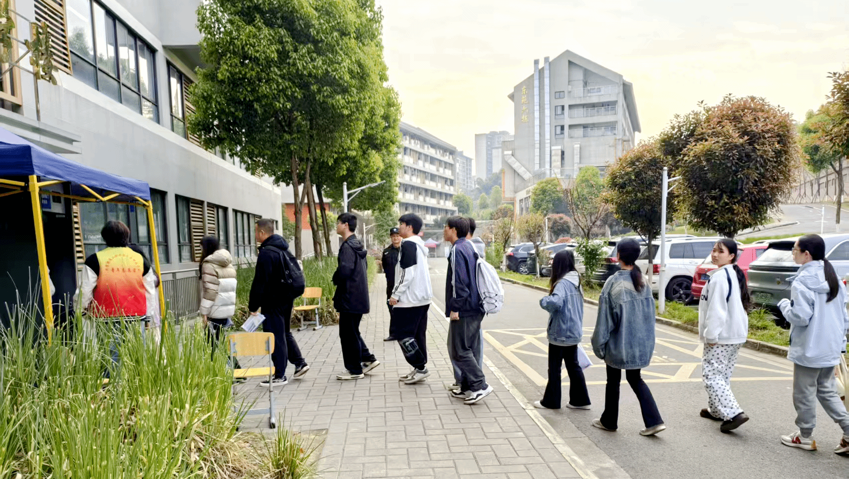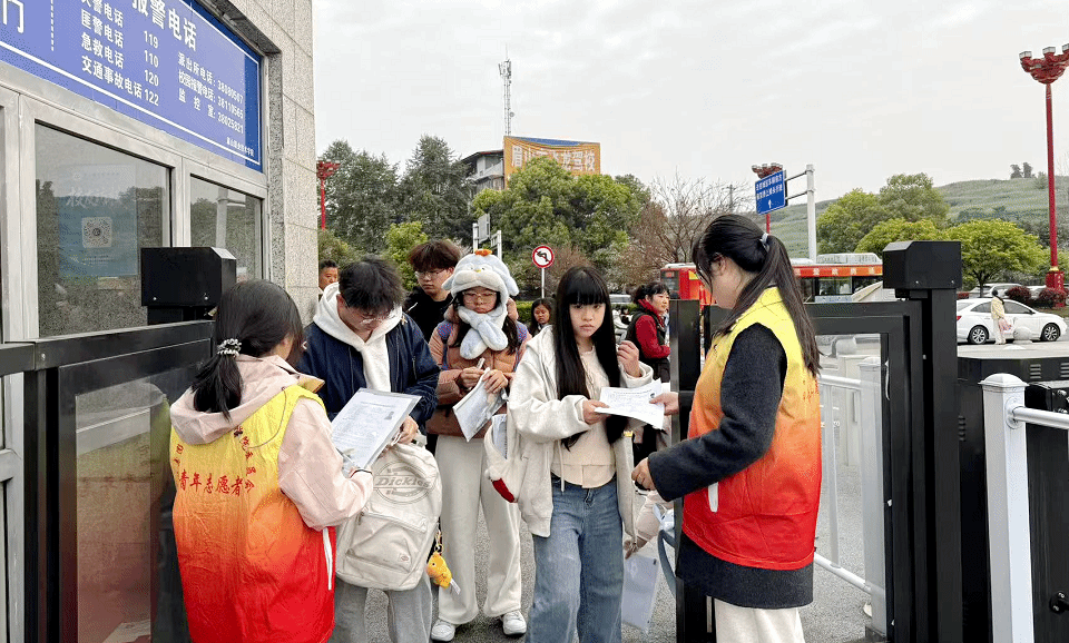 考试当天,志愿者们身着统一服装,清晨七点便全员到岗,以饱满的精神状态投入服务工作。从校门口到考场沿途,一抹抹“志愿红”成为春日校园里最亮丽的风景线。他们耐心解答考生疑问,细致指引考场路线,协助考生快速抵达考试区域;针对考生携带的通讯设备等物品,志愿者们配合考务人员有序做好存取引导工作,为2897名考生营造了安全、顺畅的入场环境。