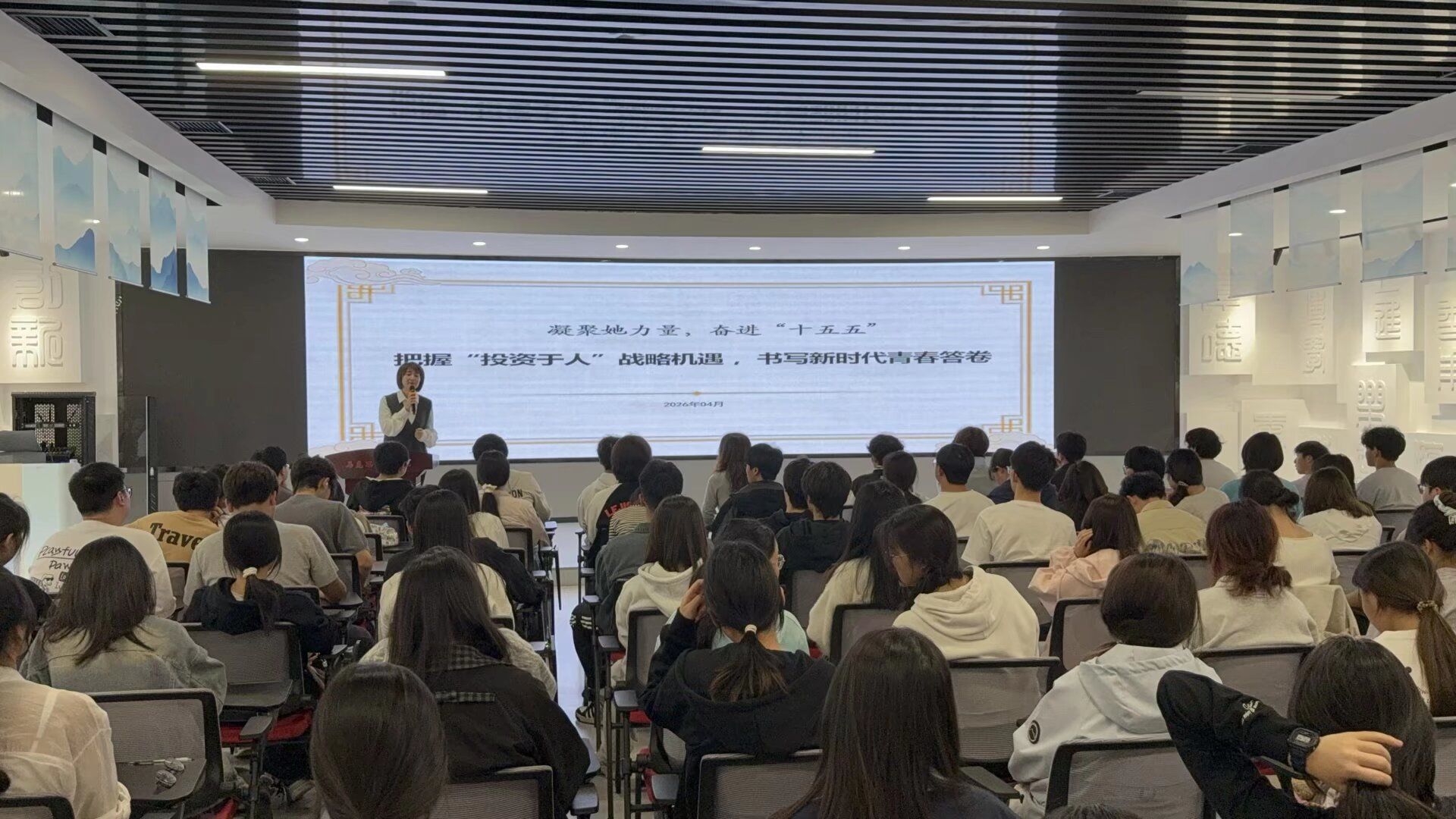 4月22日,由眉山市妇联主办,学校妇联、团委与马克思主义学院联合举办的“逐梦‘十五五’,巾帼向未来”专题讲座在学校思政虚拟仿真教育基地举行。本次讲座邀请学校妇联执委、马克思主义学院思政实践教研室主任杨琳兰老师主讲,以“把握‘投资于人’战略机遇,书写新时代青春答卷”为题,100余名学生代表参加,共同关注女性发展与时代命题。