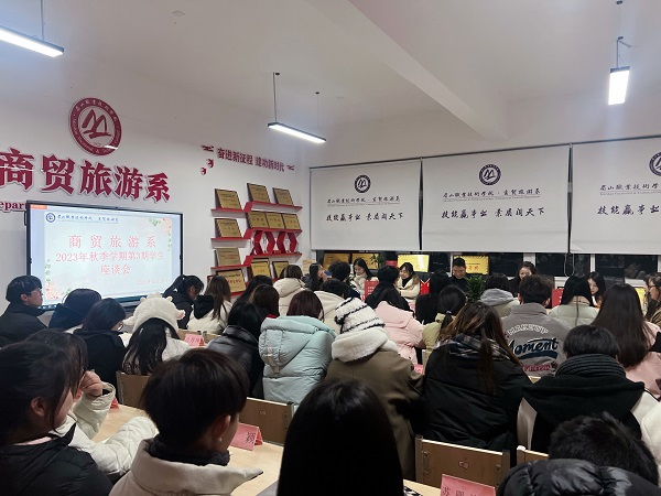 商贸旅游系副主任吴芙蓉、辅导员王建英、侯佳敏,各班级45名学生代表参加座谈会。