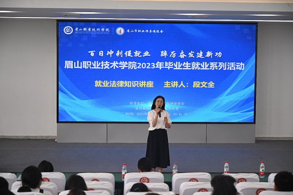 5月24日,学校在招生就业服务中心二楼就业宣讲厅举行2023年“百日冲刺”系列活动就业法律知识讲座。四川发现律师事务所主任段文全律师受邀主讲。眉山市职业指导促进会活动部部长江川林,四川发现律师事务所助理律师鲁晓蝶,学校学生工作部副部长刘菲参加讲座。