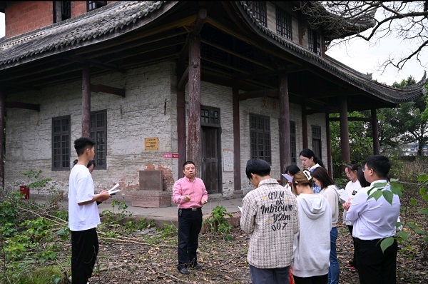 沿着寻访路线,寻访团首先来到眉山党史与地方志馆,在讲解员的带领下,全面了解了眉山地情资源、历史文化,全面认识了眉山党组织的发展以及党领导眉山人民创造美好生活的生动实践;寻访团还前往眉山县第一个特别党支部旧址——文庙、文昌宫等地进行探寻调研,受访人张献华向在场师生详细介绍了国民师范学校丁华、宁澈澄、熊飞等人建立眉山县第一个特别党支部的相关史料;寻访团还前往了彭山县公义镇郭祝三故居,通过参观、听取讲解、观看宣传视频等方式了解了彭山县革命斗争的艰苦历程以及郭氏一门三英烈的英勇事迹。