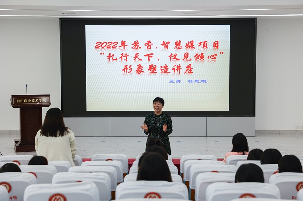 10月19日,学校妇联“苏香·智慧媛”项目“礼行天下,仪见倾心”形象塑造培训在招就中心二楼会议室开讲,商贸旅游系礼仪讲师杨惠焜担任主讲人,50名女大学生参加现场培训。