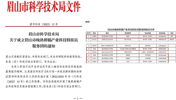 10月28日,眉山市科学技术局《关于进一步抓实新时期科技特派团和科技特派员工作的实施方案(2022-2025 年)》(川科农〔2002〕14号)文件公示了我校教师马建英(团长)、杨俊、熊艳、何志文、伏晓科入选眉山市晚熟柑橘产业科技特派员服务团。