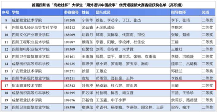 10月28日,由四川省教育厅主办、成都理工大学承办的首届四川省“高教社杯”大学生“用外语讲中国故事”优秀视频大赛落下帷幕。我系学生叶伟冲、杨卓颖、杜心烨和曾雨思在教师王璐指导,合作拍摄的《百年传承,东坡泡菜》作品在高职组66件参赛作品中获得省级二等奖。