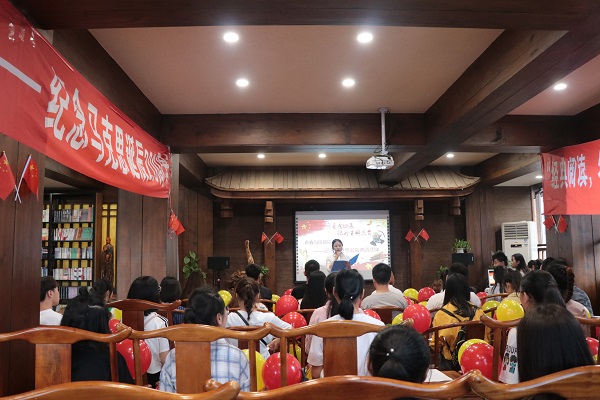宣传活动结束后,学生干部前往博学书屋,在书香四溢的会议室开展“马克思主义?青年诵”经典作品诵读活动。学生代表周兰诵读了《在马克思墓前的讲话》,将马克思毕生所学和为无产阶级事业所作的巨大贡献读给大家听;大家一起观看《你好,马克思》视频,视频诠释了“马克思不会被世界人民忘记,马克思和马克思主义是属于未来”的真谛;最后,大家还重温了《共产党宣言》,致敬经典,感悟真理力量,在经典中汲取信仰的力量。