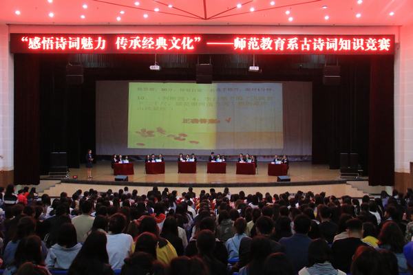为弘扬中华民族汉语言经典文化,丰富学生文化生活,5月9日下午,师范教育系在学校艺术中心开展“感悟诗词魅力 传承经典文化”古诗词知识竞赛决赛。系党总支书记丁盛、学生科科长李兴龙、团总支书记罗珍、全体辅导员及900余名学生现场观看了决赛。