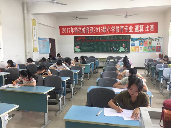 为激发学生学习数学的兴趣,拓展学生思维能力,提高学生计算能力与竞争意识,6月20日,学院师范教育系举行了第一届师范生速算比赛。比赛由李建华和周锐老师担任主考官,27名2015级小学教育专业学生参加本次速算比赛的决赛(决赛选手由各班经过初赛前三名选出)。