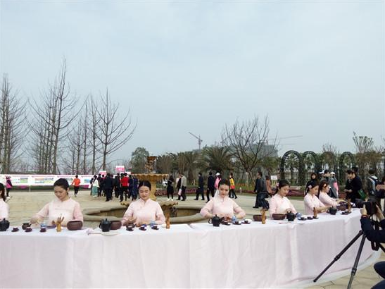 园区导游讲解员身着淡雅的宋服,与玉白的早樱应和着,如樱花仙子般,带着嘉宾游走在博览园各大景色中,俨然是一幅活动的“樱漫眉山”的美丽画卷。茶艺表演的女学生们身着淡粉色纱衣,手执一柄团扇,和着婉转幽远的音乐声,为嘉宾表演东坡茶韵。更精彩的要属长嘴壶的表演,唐成志等4名学生首先献上一个礼仪性的敬茶动作“吉龙献瑞”,他们时而把茶壶高抛空中或高举过头,时而让它在指尖飞速旋转,如行云流水般,“云龙扣月”、“青龙入海”、“游龙戏水”,等一连串动作,博得现场嘉宾阵阵掌声。