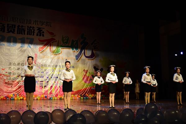 开场舞充满活力、激情四射,迅速点燃全场气氛。系主任彭瑞清向全系师生致辞,代表商贸旅游系党政班子向学院领导和全系师生致以诚挚的节日问候和美好的祝愿,介绍了该系2016年取得的成绩,号召师生员工在新的一年里振奋精神,不忘初心,继续前进,争取取得更大的成绩。浙江新荣记连锁集团总经理助理、2011级酒店管理专业优秀毕业生周璇,为“2016新荣记杯征文比赛”获奖选手刘倩、指导教师何沄涛颁奖。