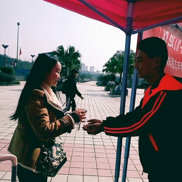 (志愿者给返校的同学递热水)
