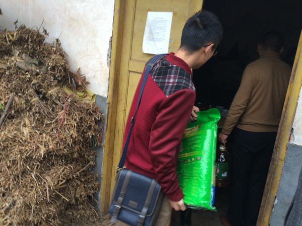 11月27日下午,在曾庙村第一书记贺仲华和村长的带领下,机关第四党支部周建军等五名党员和入党积极分子到富牛镇曾庙村7组看望因病致贫的陈国彬一家,为陈国彬一家送去了由党员自发捐赠的价值近400元的生活必需品(棉被、大米、清油、猪肉)。