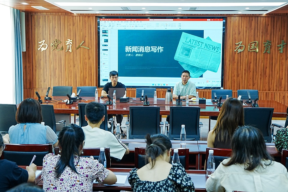 “融媒体时代,各平台都有一个3秒效应,如何在3秒内打动受众?”他结合自身工作实例,多维度、全方位地讲解了新闻消息写作方面知识。他通过对新闻稿件的案例分析,指出存在的问题和需要注意的要点,实打实地为学校宣传员做好学校宣传工作“开方子”“出点子”。