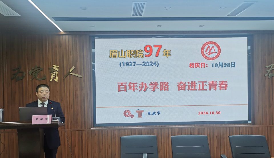 张献华讲述了眉山职业技术学院自1927年建校以来,跨越世纪的风雨历程。他从学校的创立背景、渊源和红色基因、发展历程、教师能力建设、重大项目建设、重要基地建设、党的建设、建设发展标志性成果等方面的典型案例进行讲述和展示,借助生动的校史故事、珍贵的历史图片和详实的统计数据,全面展现了学校在不同历史阶段所取得的辉煌成绩与重大成果。