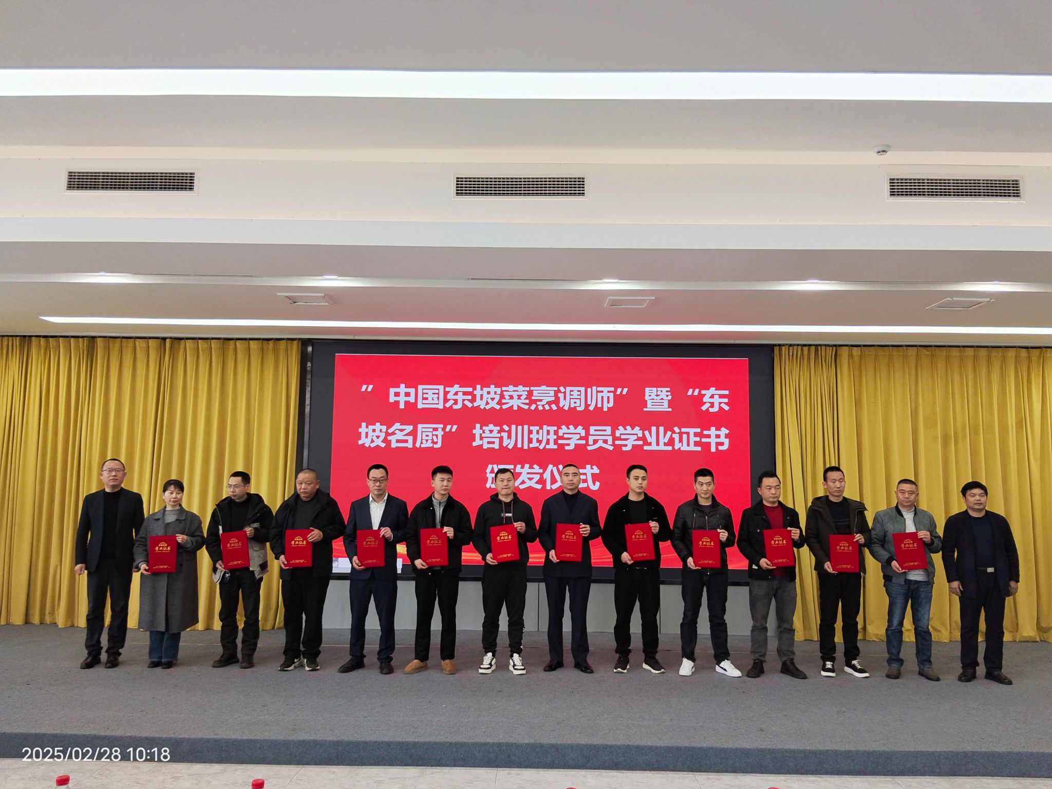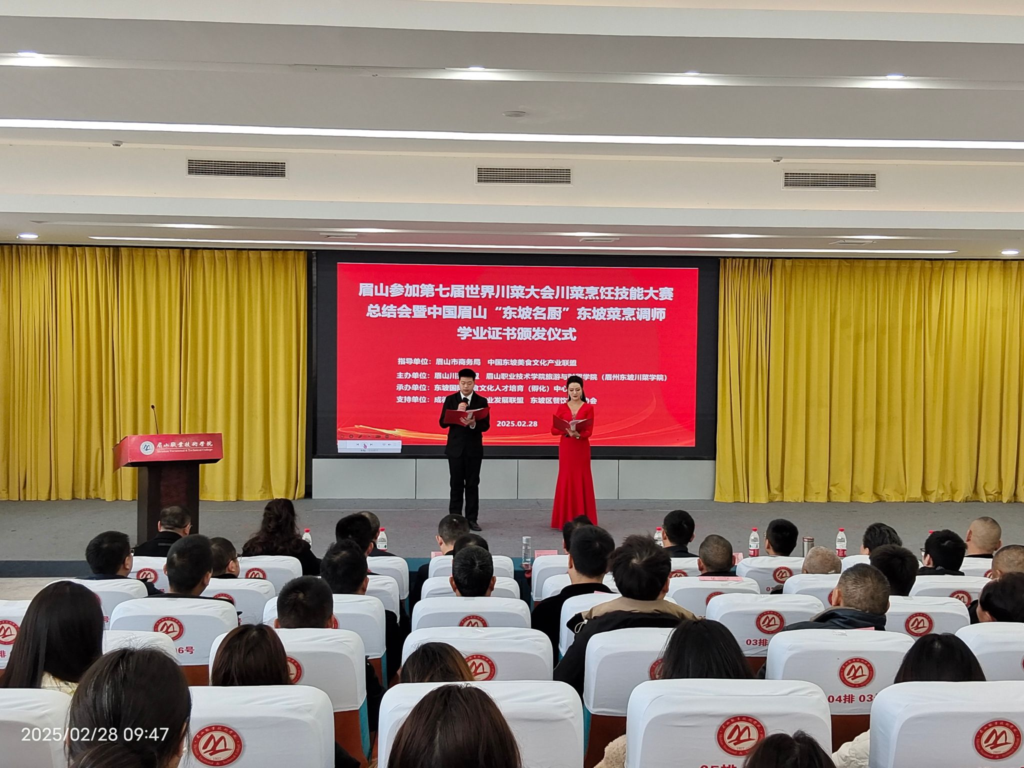 2月28日,第七届世界川菜大会川菜烹饪技能大赛参赛总结会暨“东坡名厨”东坡菜烹调师学业证书颁证仪式在我校招就中心二楼会议室举行。