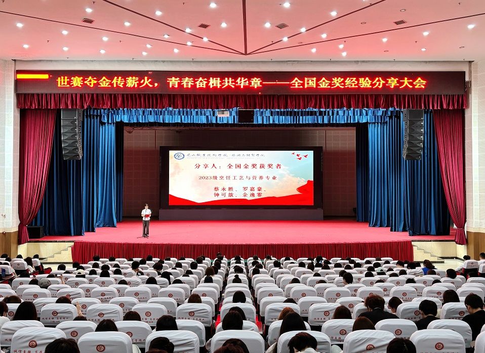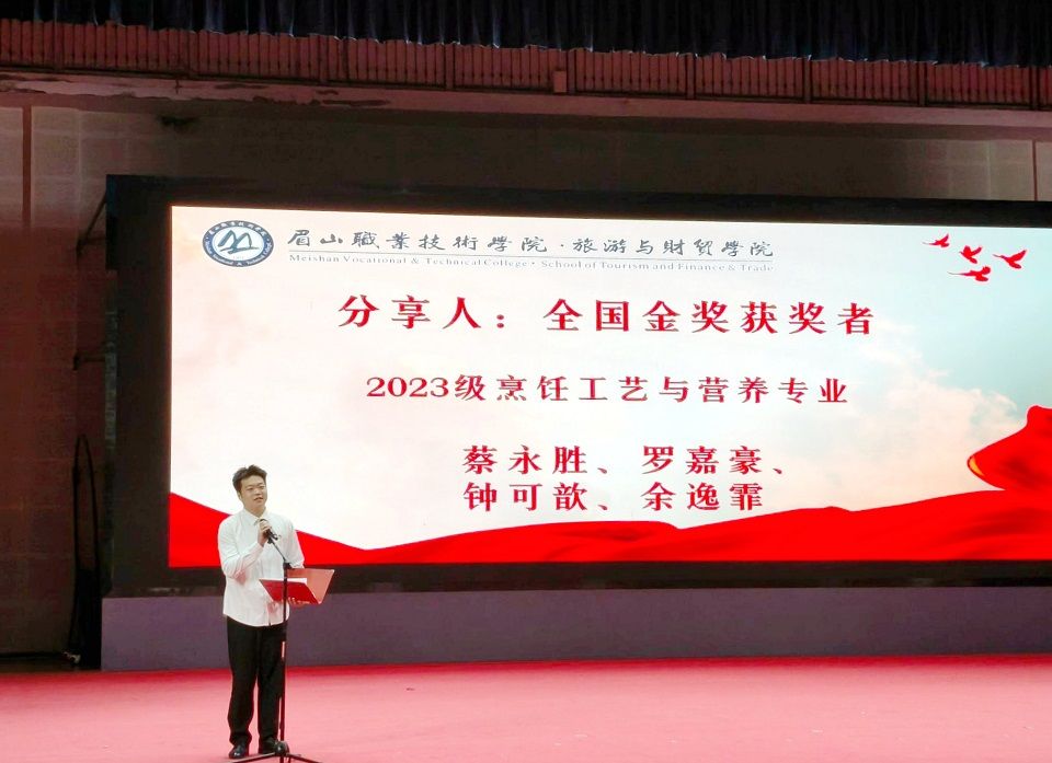 9月16日,旅游与财贸学院在艺术中心举办2025年世界职业院校技能大赛餐饮赛道金奖团队经验分享会,活动以“世赛夺金传薪火,青春奋楫共华章”为主题总结夺金经验、传递拼搏精神,分享会由学院党支书记袁娇主持。