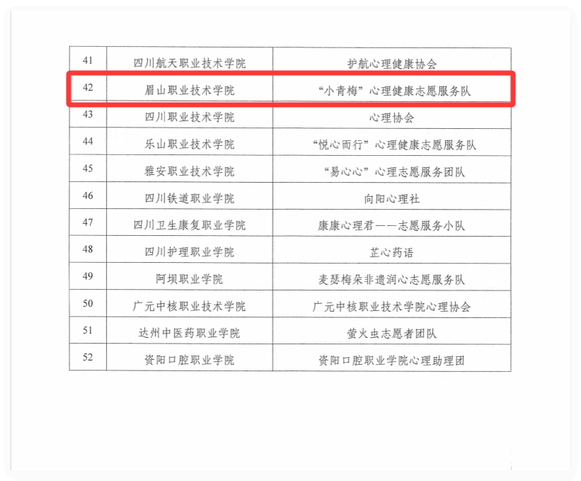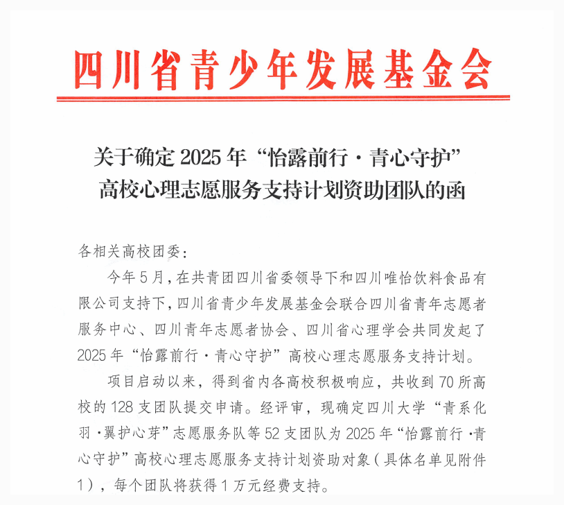 近日,2025年四川省“怡露前行·青心守护”高校心理健康志愿服务支持计划资助名单正式公布。我校“小青梅”心理健康志愿服务队凭借其创新的服务方案、扎实的实践基础和显著的育人成效,从全省70多所高校的128支申报团队中脱颖而出。这是我校在该类项目上首次获得省级专项资金支持,标志着我校心理育人工作获得了省级平台的高度认可。