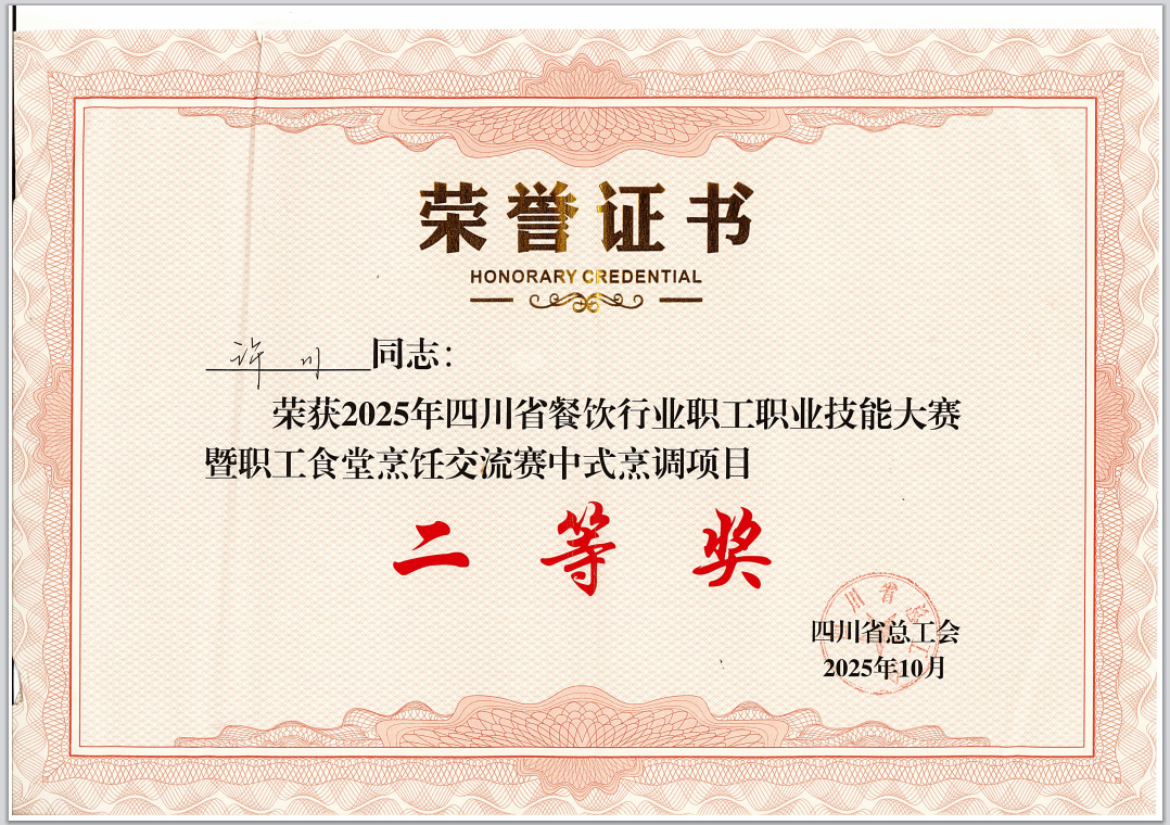 10月14日,由四川省总工会主办的2025年四川省餐饮行业职工职业技能大赛在宜宾市落幕,我校烹饪工艺与营养专任教师、东坡肘子非遗传承人许川在中式烹调项目中喜获二等奖(第二名)、作品获评“金牌菜”称号。