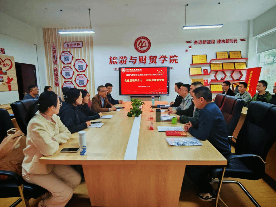 10月21日,旅游与财贸学院教师党支部与眉山市食品安全学会党支部在学校第2教学楼2212会议室联合开展基层党组织结对共建主题党日活动。眉山市食品安全学会会长刘忠、党支部书记刘清华,旅游与财贸学院党总支副书记、院长廖明江,教师党支部书记佘明英以及双方党员参加活动。