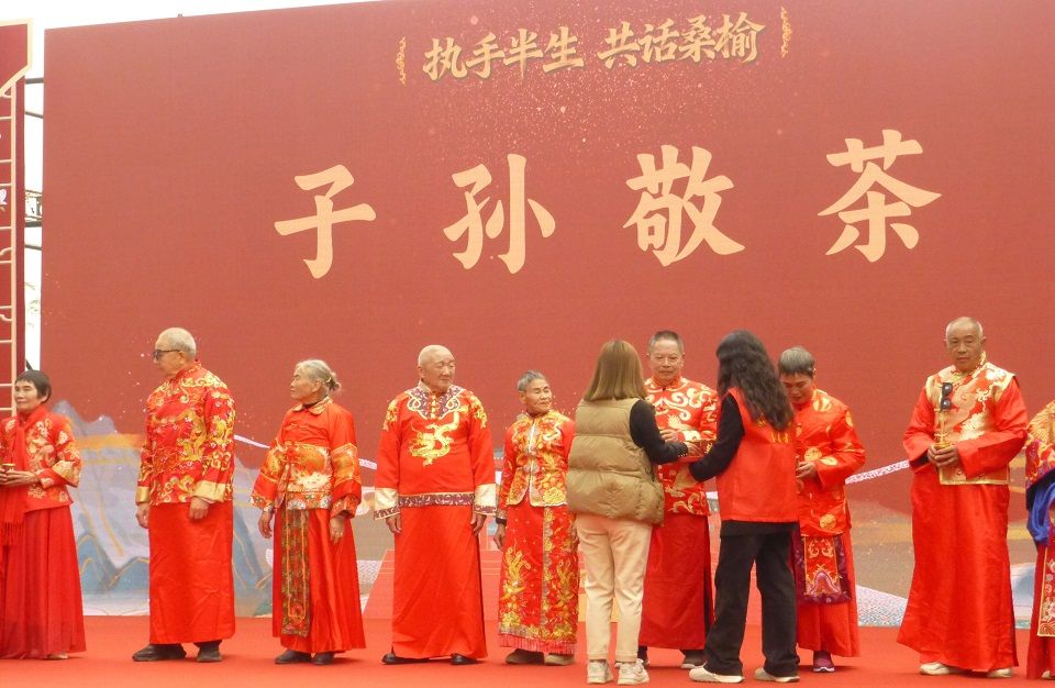 活动现场暖意融融,仪式感十足。12对身着大红传统婚服的金婚、银婚夫妇,在20名青年志愿者的全程陪伴与700余名社区居民的真挚祝福中,缓缓踏上红毯,重温携手半生的心动与坚守。银婚夫妇现场演绎“敬拜天地”“共饮合卺酒”等传统婚俗,一招一式间尽显中华优秀传统婚俗文化的深厚底蕴;金婚夫妇端坐台前接受“子孙敬茶”,茶香氤氲中满是家族传承的幸福,随后参与的“云游名山大川”影像拍摄,更将岁月沉淀的爱意永久留存。老人们相濡以沫、互敬互爱的真挚情感,深深打动了在场每一位观众。社区文艺队伍带来的歌舞、戏曲等精彩表演,更让现场掌声不断,处处洋溢着团圆祥和、温馨愉悦的节日氛围。