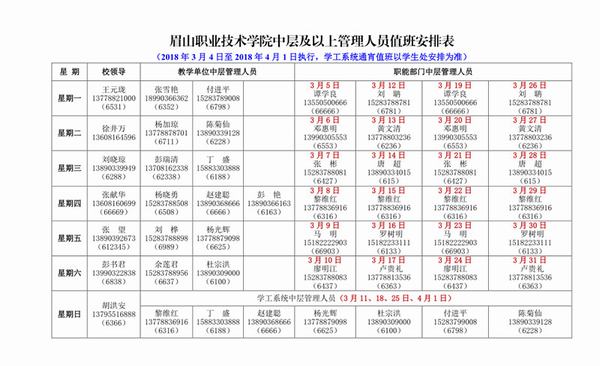 眉山职业技术学院中层及以上管理人员值班安排表