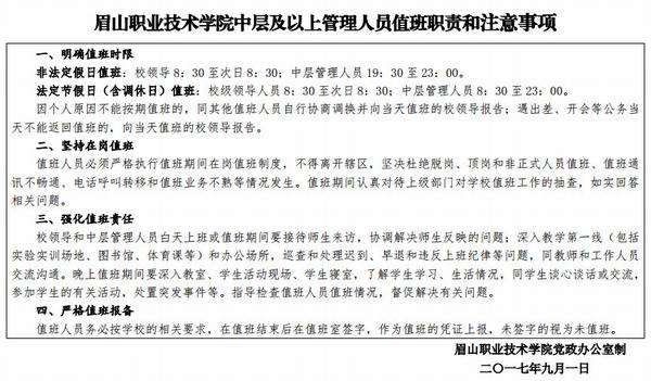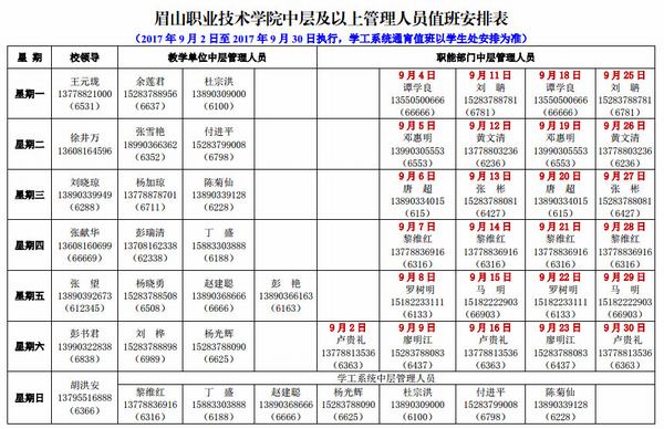 眉山职业技术学院中层及以上干部值班安排表(2017年9月)