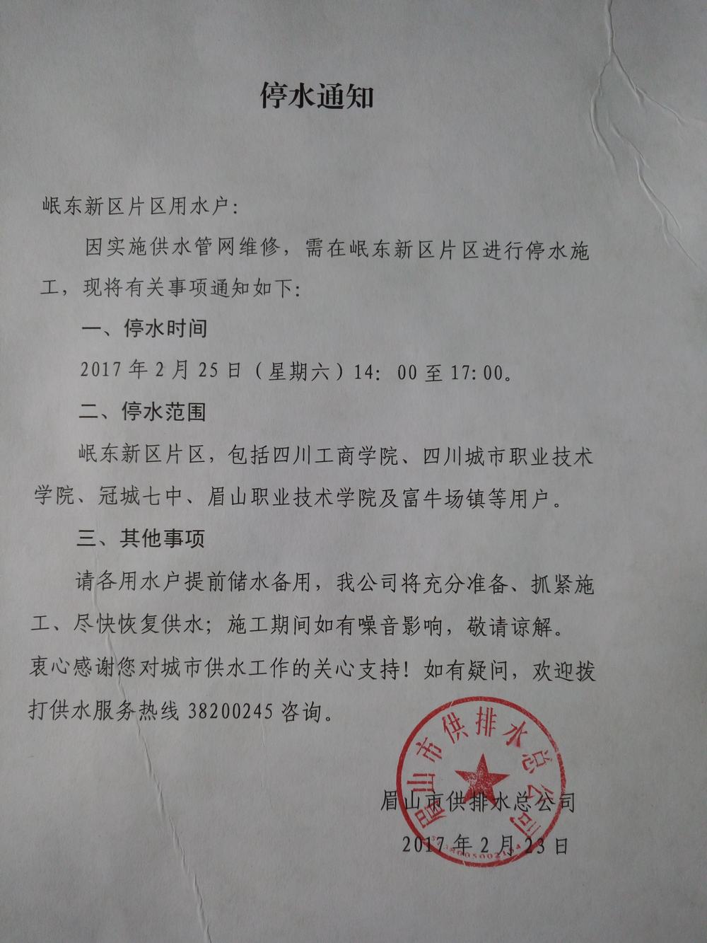 关于2017年2月25日停水的通知