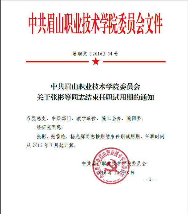 中共眉山职业技术学院委员会关于张彬等同志结束任职试用期的通知