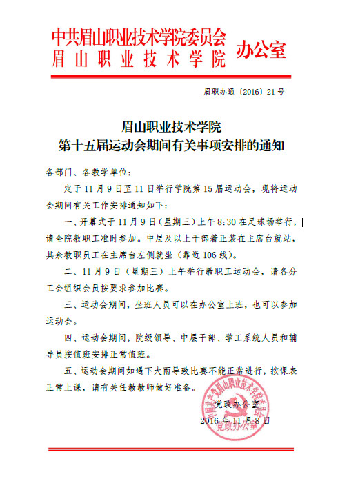 眉山职业技术学院第十五届运动会期间有关事项安排的通知