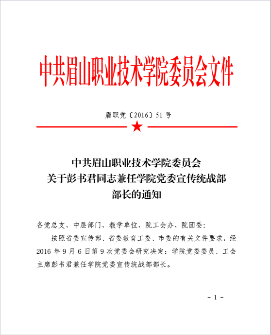 关于彭书君同志兼任学院党委宣传统战部部长的通知