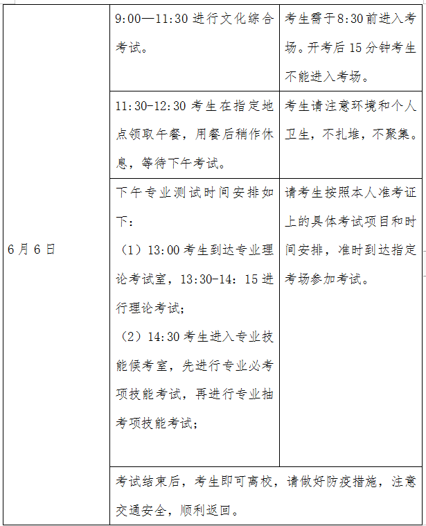4、6月6日进行文化综合和专业测试。考生请于8:30前到学校校门口依序排队,测量体温,核查健康码后进入考场,有发烧发热情况按学校疫情应急方案处理;因考生较多,请妥善安排时间,提早到校,以免错过考试时间。