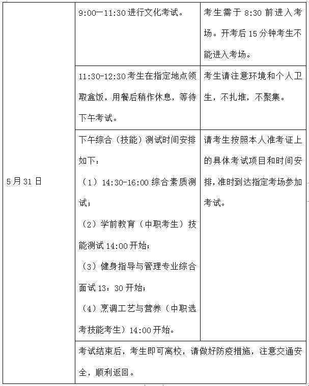 4、5月31日进行单独招生文化和综合(技能)测试。考生请于8:30前到学校校门口依序排队,测量体温,核查健康码后进入考场,有发烧发热情况按学校疫情应急方案处理;因考生较多,请妥善安排时间,提早到校,以免错过考试时间。