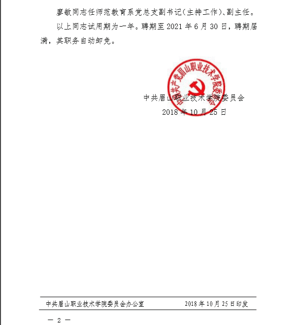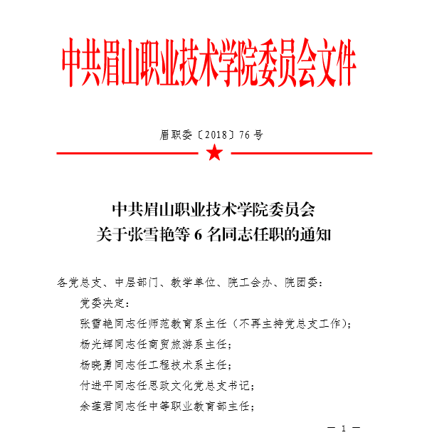 中共眉山职业技术学院委员会关于张雪艳等6名同志任职的通知