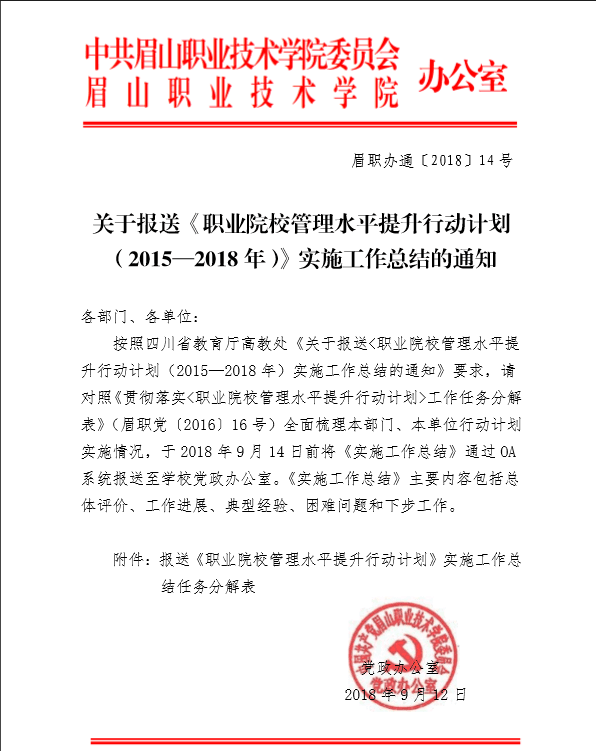 眉山职业技术学院关于报送《职业院校管理水平提升行动计划(2015—2018年)》实施工作总结的通知