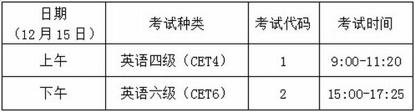 CET考试时间为12月15日,考试科目为英语四级和六级。