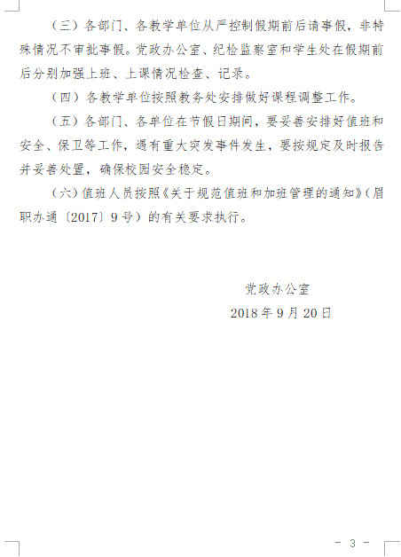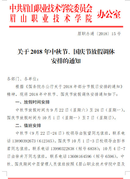 眉山职业技术学院关于中秋节、国庆节放假调休安排的通知