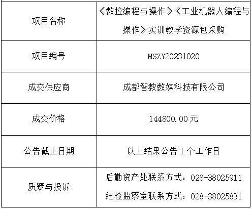 《数控编程与操作》《工业机器人编程与操作》实训教学资源包采购项目竞争性磋商结果公告