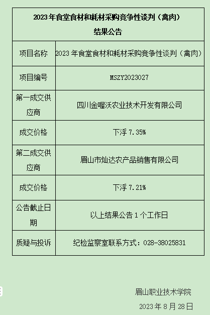 2023年食堂食材和耗材采购竞争性谈判(禽肉)结果公告