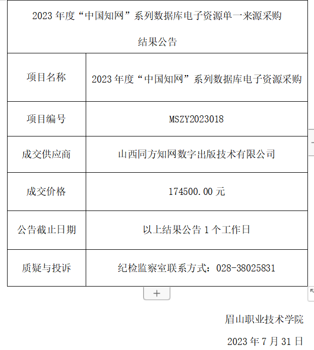 2023年度“中国知网”系列数据库电子资源 单一来源采购结果公告