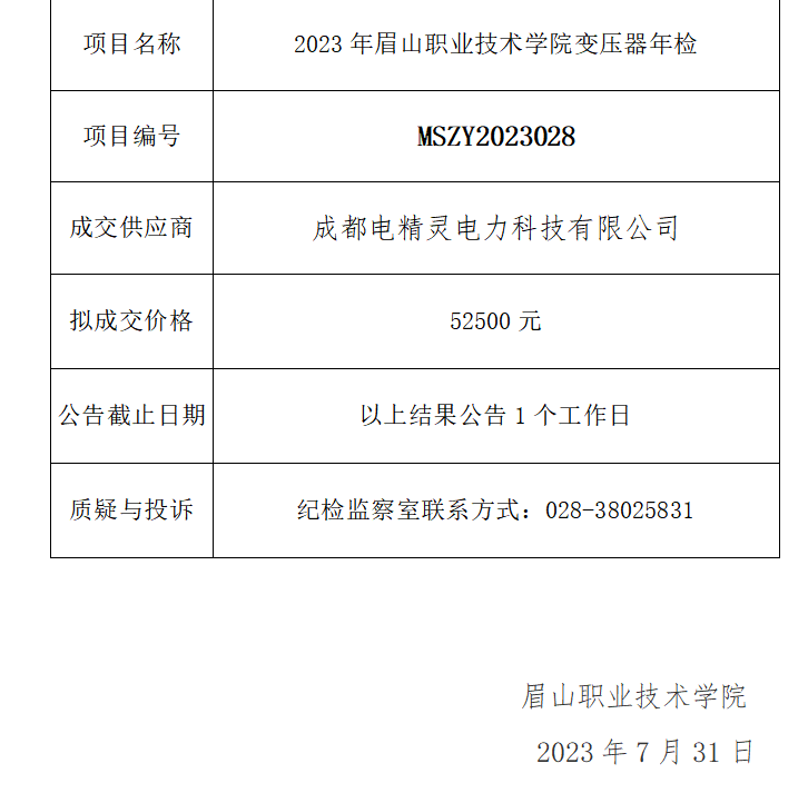 2023年眉山职业技术学院变压器年检项目竞争性谈判结果公告