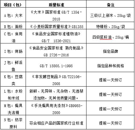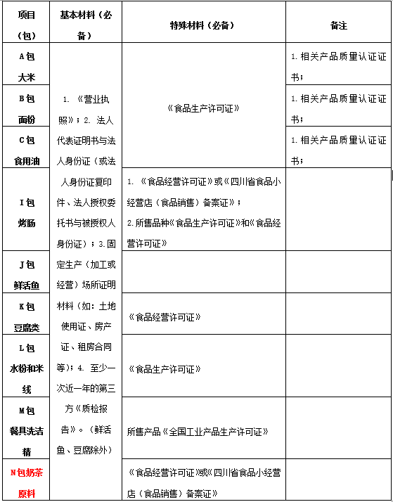 包括:鲜活鱼、豆腐类、水粉和米线、奶茶原料、餐具洗洁精共5个独立包。