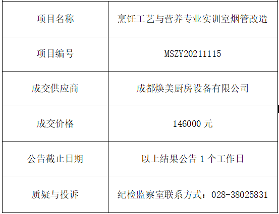 烹饪工艺与营养专业实训室烟管改造项目竞争性谈判结果公告