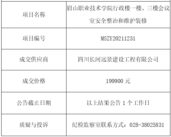 下一条:眉山职业技术学院行政楼一楼、三楼会议室安全整治和维护装修项目邀请公告