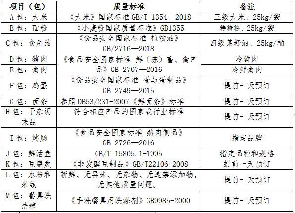 备注:学校为便于食材验收,制定了食材验收标准(详见合同主要条款附件),学校标准与国家标准、行业标准不一致的,以高者为准。