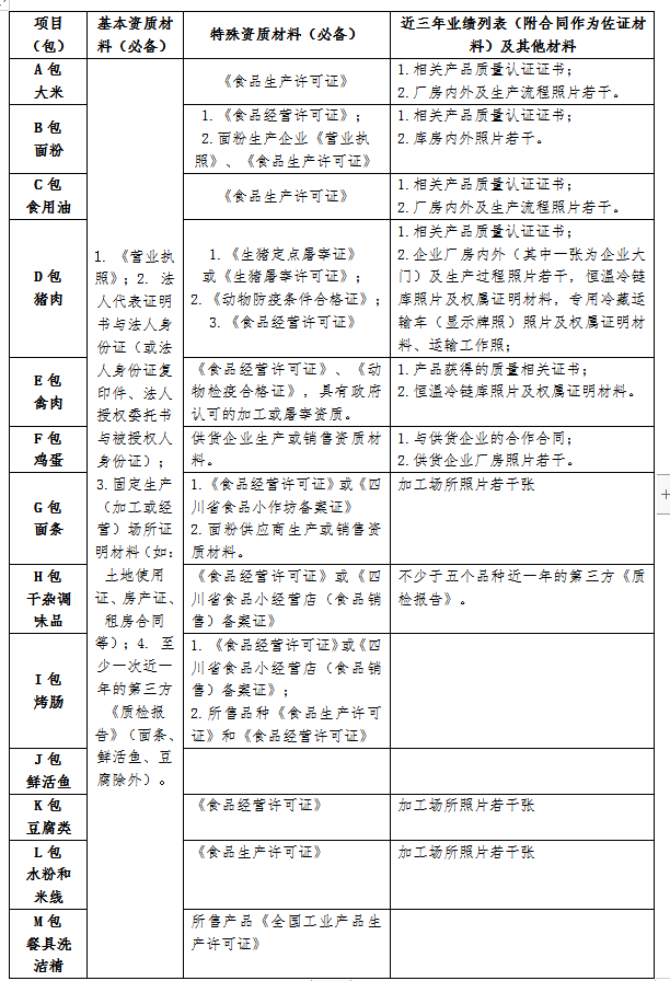包括:大米、面粉、食用油、猪肉、禽、鸡蛋、面条、干杂调味品、火腿肠、鲜活鱼、豆腐类、水粉和米线、餐具洗洁精共13个独立包。