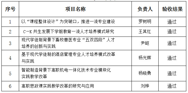 根据《四川省教育厅关于开展四川省2018-2020年高等教育人才培养质量和教学改革项目结题验收的通知》的相关要求,遵循公开、公平、公正及回避原则,学校成立了由校内外共计7名专家组成的评审专家组,于2020年11月20日召开了项目验收专题评审会,现场经过听取汇报、查阅资料、集中评议等环节,专家组形成了一致意见,同意《以“课程整体设计”为突破口,推进一流专业建设》等6个四川省2018-2020年高等教育人才培养质量和教学改革项目验收通过。经研究决定,现将验收结果进行公示。