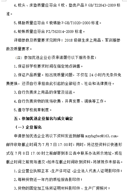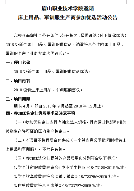 眉山职业技术学院邀请床上用品、军训服生产商参加优选活动公告